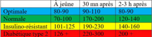 Voici le tableau des taux de glucose dans le sang, en milligrammes, à différents paliers, qui nous renseigne sur notre état de santé. La couleur bleue indique une bonne santé, mais une nourriture saine est toujours souhaitée ; la couleur verte, un début de résistance à l’insuline, qui doit nous interpeller à faire attention à notre alimentation ; le jaune, on est dans la résistance à l’insuline qui ne tarde pas à se muer en diabète type 2, que l’on doit corriger ; le rouge, c’est le diabète type 2, un état que l’on doit soigner par un médicament, la Metformine, la plus efficace des hormones mais qui ne combat que les effets et nuit sur le long terme, fort bien qu’on peut le corriger avec une alimentation saine à base de gras, de fibres, de protéines et de glucides lents en quantités limitées et en limitant les repas à trois.
